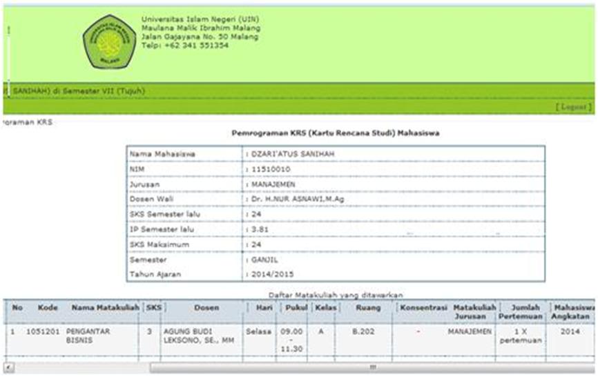 Setelah memilih input mata kuliah, kita sudah selesai memilih mata kuliah dan hasil inputan akan di tampilkan seperti ini: