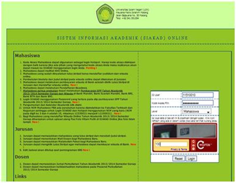 Isi ID USER dengan NIM anda, kode akses/ Pin sesuai yang anda dapatkan dari bank saat mendaftar kuliah, pada level pilih mahasiswa. Isi kotak sesuai dengan huruf dan angka yang tertera diatasnya, kemudian klik Login.