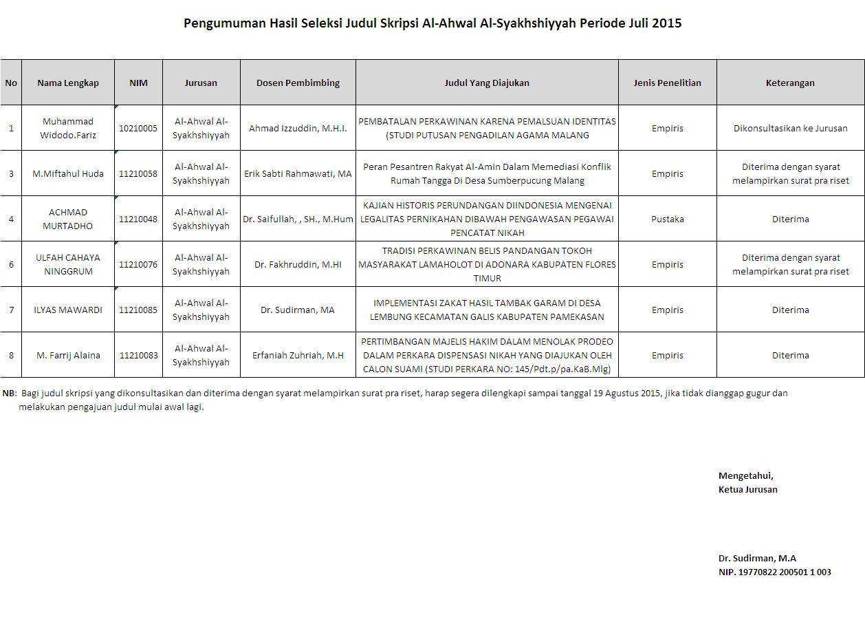Pengumuman Hasil Seleksi Judul Juli 2015 Jurusan Al-Ahwal Al-Syakhshiyyah