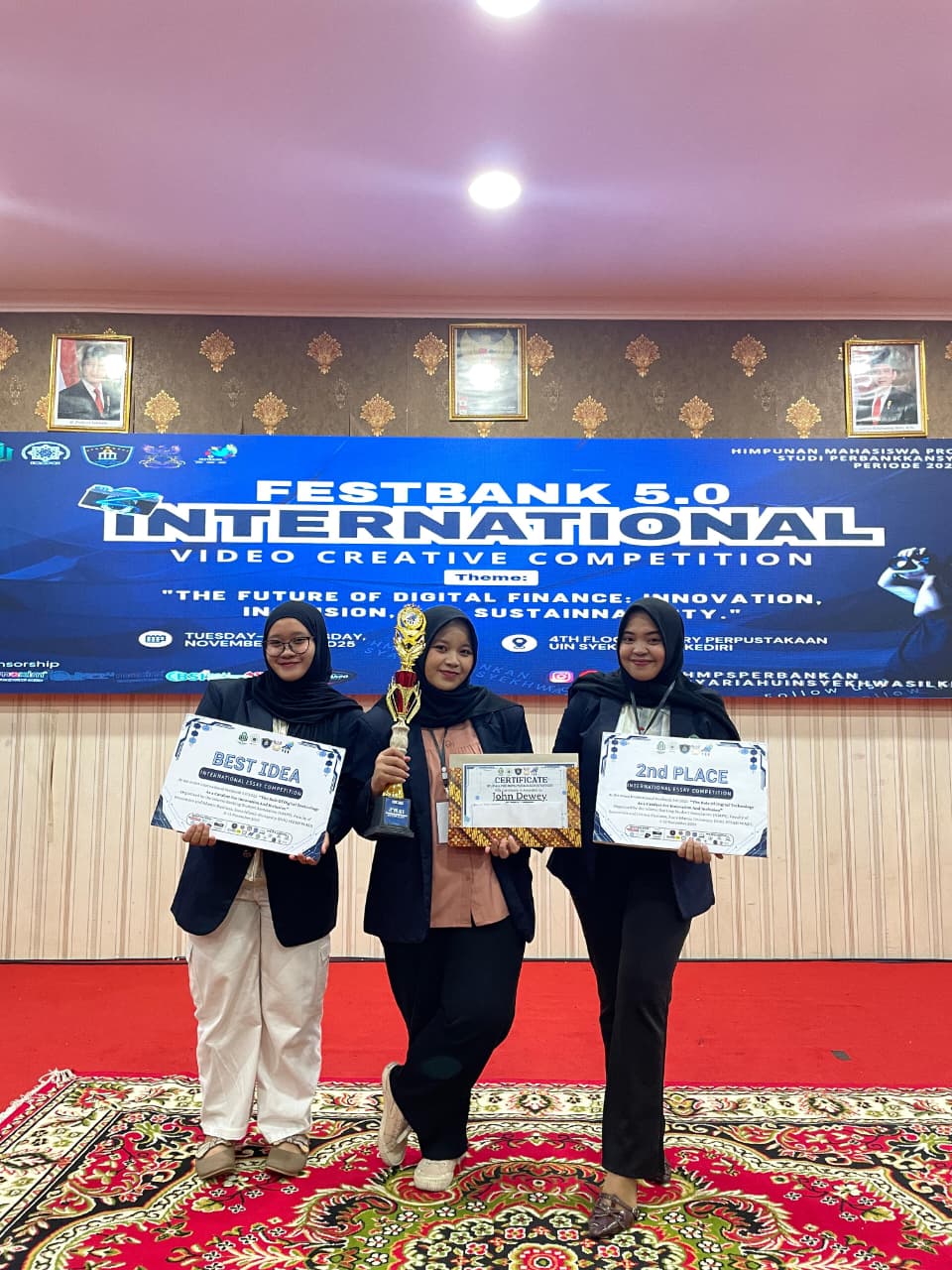 SYARIAH – Rabu, 12 November 2025, tiga mahasiswi Fakultas Syariah UIN Maliki berhasil menyabet juara 2 ajang International Essay Competition Festbank 5.0 yang diselenggarakan HMPS Perbankan Syariah UIN Syekh Wasil Kediri. Ketiga mahasiswi tersebut adalah Elvira Rosiana Indah (Prodi Hukum Tata Negara), Diva Kurnia Dwi Salsabila (Prodi Hukum Tata Negara), dan Varda Ayu Fitria Ramadhani (Prodi Hukum Keluarga Islam).
