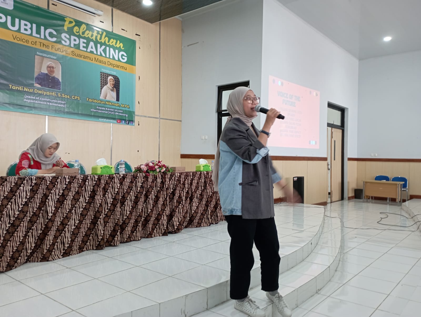 Sementara itu, Ibu Faridatun Nikmah, M.Pd., menjelaskan bahwa public speaking merupakan proses komunikasi terstruktur yang disampaikan di depan umum, baik berupa pidato, presentasi, maupun bentuk komunikasi lisan lainnya.