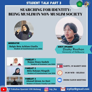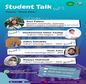 Reporter: Agniski Pininta Internasional Class Program Fakultas Syari’ah kembali mengadakan kegiatan student talk untuk yang ketiga kalinya pada hari Sabtu, 19 Maret 2022 melalui zoom meeting. Kegiatan tersebut dihadiri oleh semua mahasiswa ICP Fakultas Syari’ah dan juga guest speaker, yaitu Dzaky Rosihan yang merupakan salah satu mahasiswa University Of Melbourne.