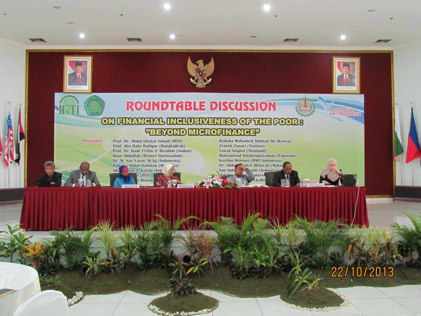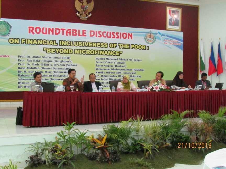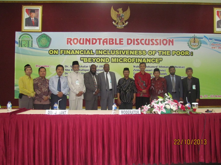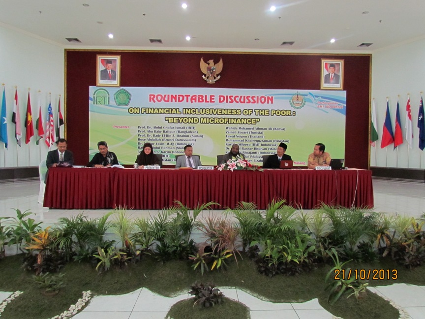 Kegiatan international roundtable discussion dengan tema “financial inclusiveness of the poor: beyond microfinance” yang dilaksanakan atas kerjasama antara, Fakultas Syariah UIN Maulana Malik Ibrahim Malang dan Islamic Researcrh and Training Institute (IRTI/GIDB) Jeddah, berkaloborasi dengan Perhimpunan BMT Indonesia pada hari Senin – Selasa tanggal 21 – 22 Oktober 2013 di Auditorium Gedung Dr. (Hc), Ir. Soekarno lantai V UIN Maliki Malang dengan menghadirkan narasumber dari sepuluh negara yaitu Prof. Abdul Ghafar Ismail, P.hD. (IRTI Jeddah), Prof. Abu Bakr Rafique (Bangladesh), Prof. Dr. Badr Al-Din A. Ibrahim (Sudan), Rose Abdullah (Brunei Darussalam), Rahana Abdul Rahman (Malaysia), Dr. Abdul Bashar Bhuiyan (Malaysia), Tawai Noipom (Thailand), Muhammad Khaleequzzaman (Pakistan), Adiwarman A. karim (BMT Indonesia), Wahida Mohamed Athman Ali (Kenya), Zeineb Zouari (Tunisia), Dr. Abdelrahman Elzahi (IRTI Jeddah),  Kartiko Wibowo (BMT Indonesia), Dr. Widiyanto Mislan (Indonesia), Hakimi Syafiai (Malaysia), Dr. Hylmun Izhar (IRTI Jeddah), Nur Indah Riwajanti (Indonesia), dan Dr. M. Nur Yasin, M.Ag (Indonesia).