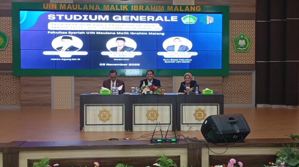 MALANG – Fakultas Syariah Universitas Islam Negeri (UIN) Maulana Malik Ibrahim Malang menggelar Stadium Generale bertema “Peran Mahkamah Agung dalam Pengembangan Hukum dan Prospek Sarjana Hukum di Indonesia” di Hall Lantai V Rektorat, Senin (3/11/2025). Acara menghadirkan Hakim Agung MA RI, Dr. H. Imron Rosyadi, S.H., M.H., yang menegaskan bahwa kecerdasan buatan (Artificial Intelligence/AI) tidak akan mampu menggantikan peran hakim dalam menegakkan keadilan substansial.
