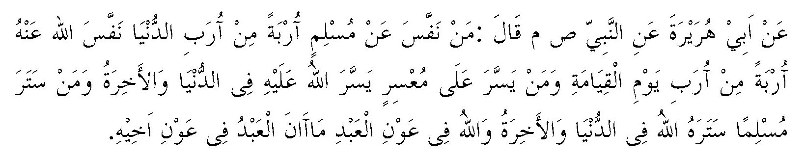 “Dari Abu Hurairah ra., Nabi SAW bersabda: Barang siapa menghilangkan satu macam kesusahan dunia sesama muslim, maka Allah akan menghilangkan satu kesusahannya di hari kiamat. Dan barang siapa yang mempermudah orang yang sedang dalam kesulitan, maka Allah akan mempermudah dia di dunia dan akhirat dan Allah akan menolong hambanya selagi hamba itu mau menolong saudaranya”. (HR. Muslim)[14]