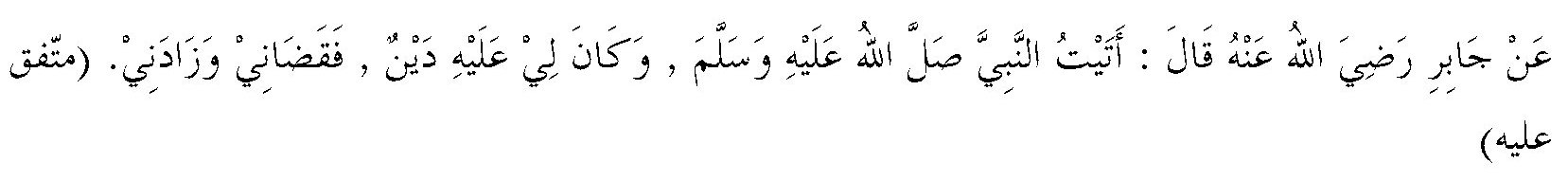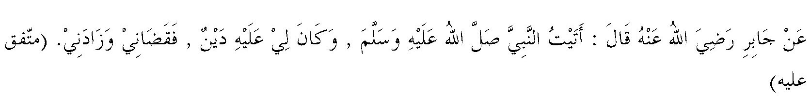 “Dari Jabir RA. ia menuturkan, “aku mendatangi Nabi SAW, sementara beliau mempunyai suatu hutang kepadaku, lalu beliau melunasinya dan menambahinya”. (Muttafaq ‘Alaih)