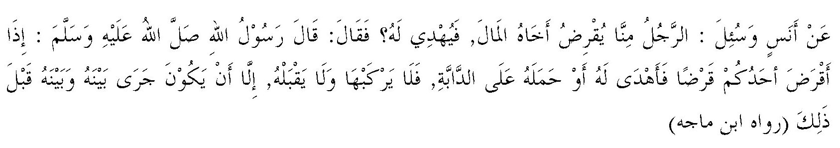 “Dari Anas, ia ditanya, “seseorang di antara kami meminjamkan uang kepada saudaranya, lalu si peminjam memberi hadiah kepada yang meminjaminya?” Anas menjawab, “Rasulullah SAW bersabda, ‘Apabila seseorang di antara kalian memberi pinjaman, lalu yang diberi pinjaman memberi hadiah kepadanya atau membawanya di atas kendaraan, maka janganlah ia menaikinya dan jangan menerimanya, kecuali jika hal itu memang biasa ia lakukan antara si peminjam dan si pemberi pinjaman.” (HR. Ibnu Majah)