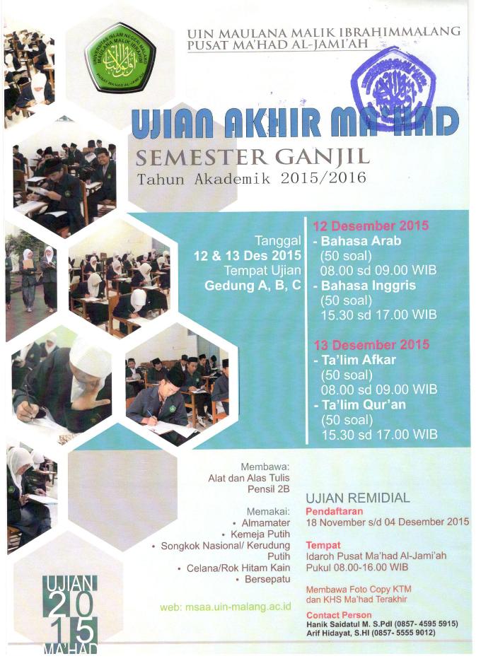 DIBERITAHUKAN KEPADA SEGENAP MAHASISWA/I JURUSAN HUKUM BISNIS SYARIAH YANG BELUM LULUS MA’HAD UNTUK MENGIKUTI UJIAN REMIDI YANG AKAN DILAKSANAKAN PADA HARI SABTU – MINGGU, 12-13 DESEMBER 2015 TEMPAT GEDUNG A, B, DAN C KAMPUS UIN MALIKI MALANG.